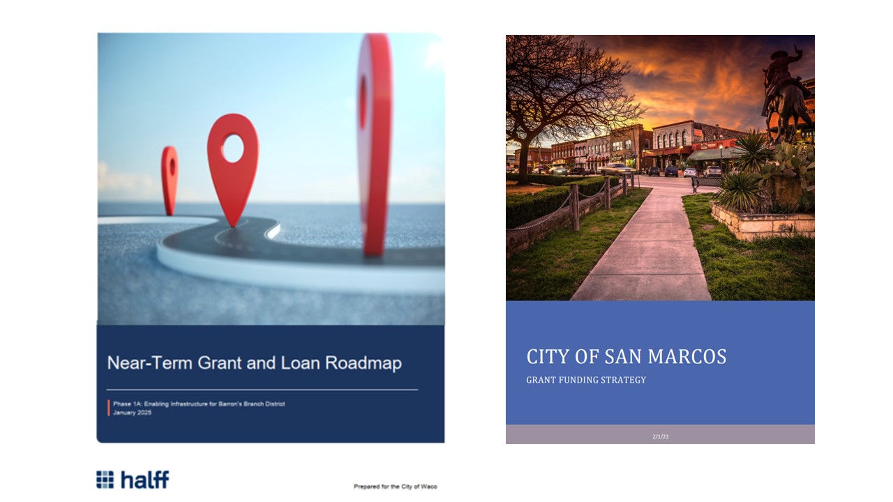 Covers of the grant roadmap and grant funding strategy deliverables for the City of San Marcos, Texas.