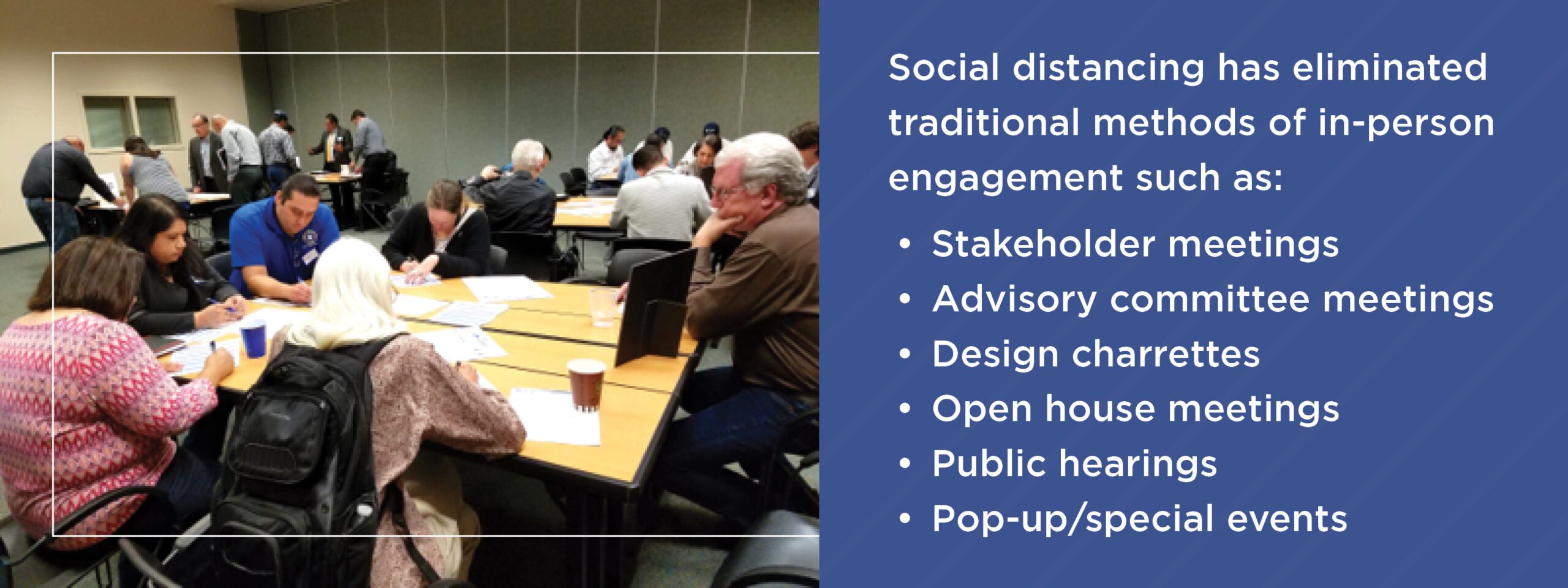 Social distancing has eliminated traditional, in-person opportunities such as town hall and open house meetings, focus groups, walking and biking tours, public hearings, steering committee meetings, neighborhood meetings, community events and more.